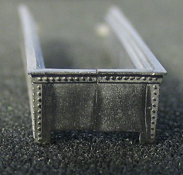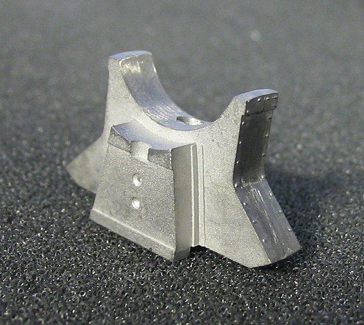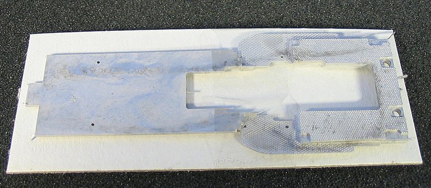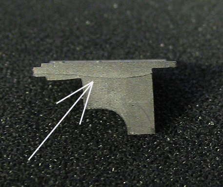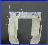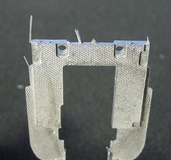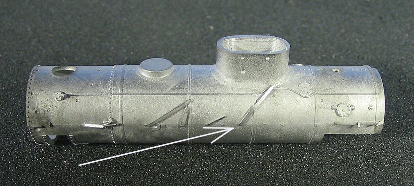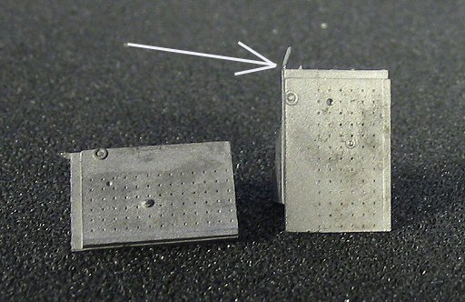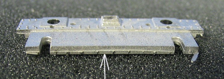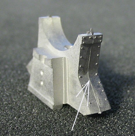 Hier der Rauchkammerträger. Die feine Formtrennkante ist zu entfernen. Um die feinen Nieten nicht zu beschädigen, empfehle ich, dass Sandpapier in kleine Stücke zu schneiden und auf einem dünnen Stück Holz aufzuziehen. Mit dieser kleinen “Feile” kann dann zwischen den Nieten geschliffen werden.