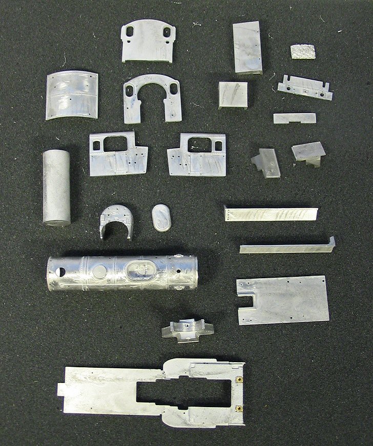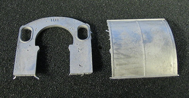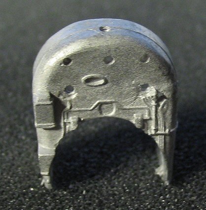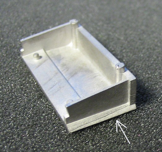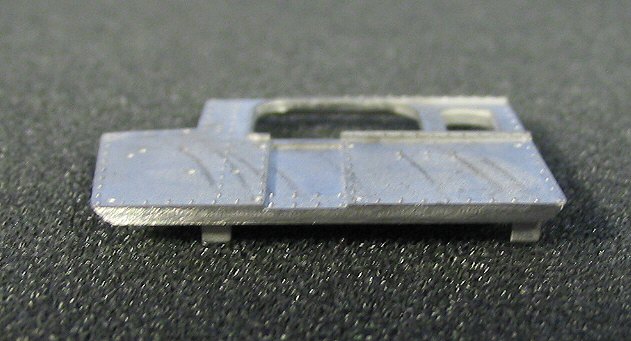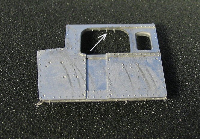 Die Seitenwände des Gehäuses weisen in den Fenstern und an der Unterseite leichte Grate auf. Die Rückwand nur an der Unterseite. Etwas schwieriger gestaltet sich das Verputzen des Daches. Die einzelnen Grate sind zunächst mit dem Skalpell zu stutzen. Danach ist alles vorsichtig zu verschleifen. Darauf achten, dass die feine Dachkante nicht beschädigt wird. Bitte das Dach auf eine weiche Unterlage legen. An der Oberseite des Daches sind jede Menge Nieten - diese sollten auch nach dem Verputzen noch sichtbar sein.