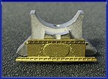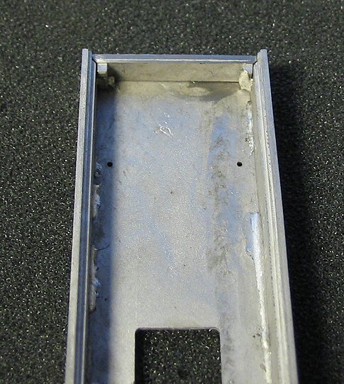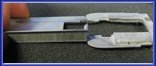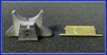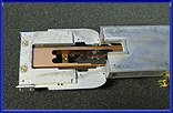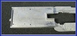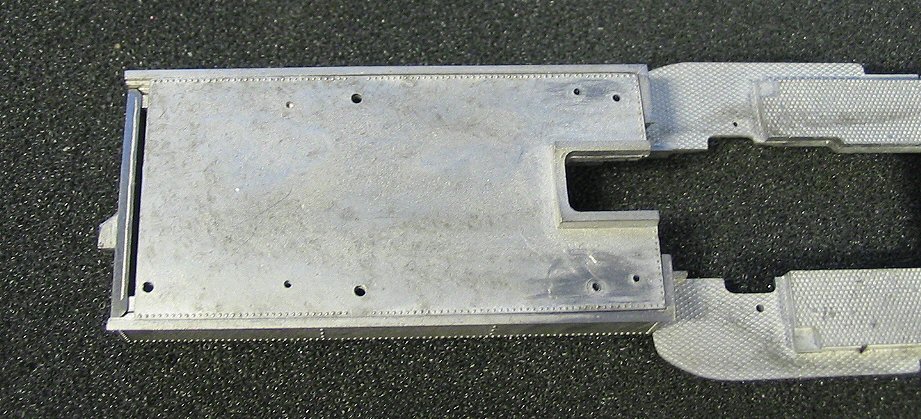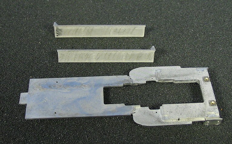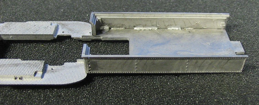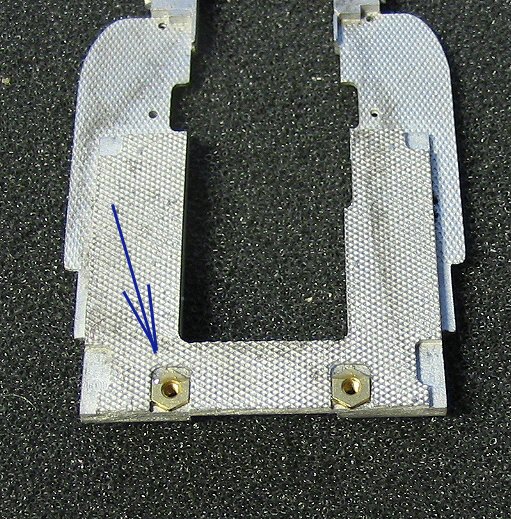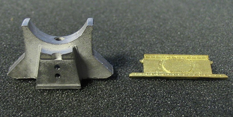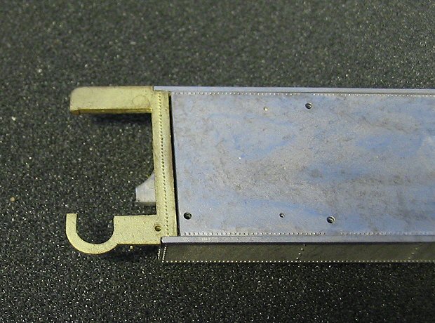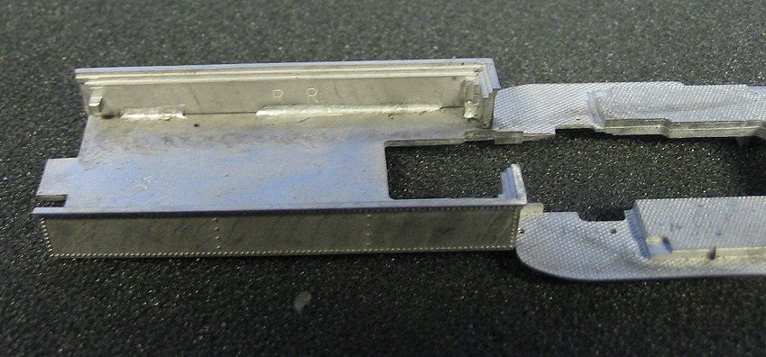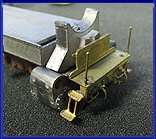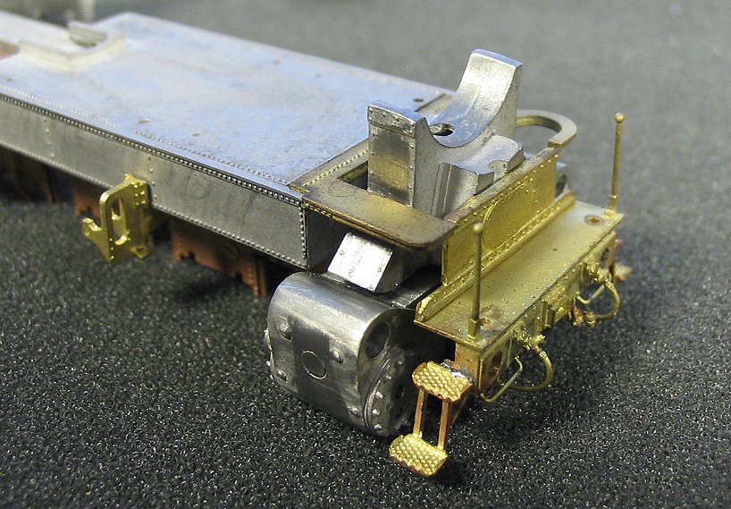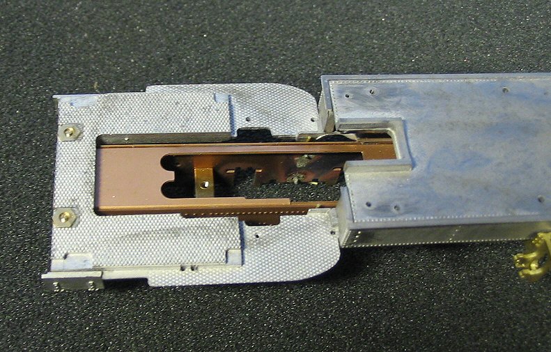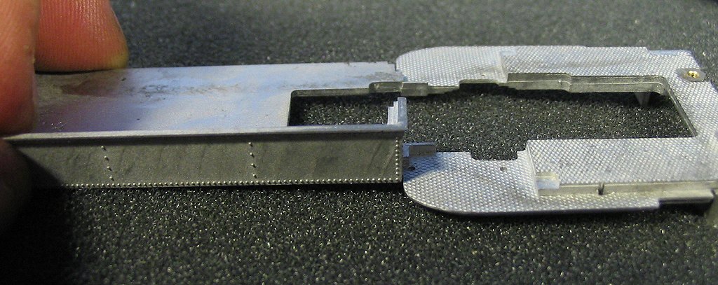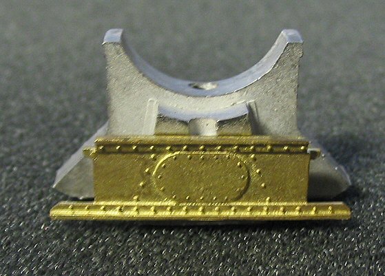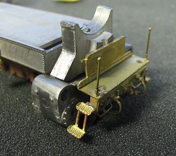 Nun kann das vordere Umlaufblech eingeklebt werden. Löten geht hier aufgrund der unterschiedlichen Metalle nicht. Wie zu sehen ist, entsteht an meinem Modell nach dem Einsetzen ein deutlicher Spalt. An dieser Stelle habe ich, um zu prüfen, ob der vordere Umlauf nicht zu weit hervorsteht, dass bis dahin fertige Teilgehäuse mit dem Rahmen verschraubt. Allerdings kann dabei nur hinten am Rahmen die Umlaufplatte angeschraubt werden. Daher die Schrauben nicht zu fest anziehen, da sonst der vordere Umlauf vorn angehoben wird. Vorn gibt es in diesem Bauabschnitt noch keine Fixierung. Das fertige Gehäuse wird später durch eine Schraube im Schornstein mit dem Rahmen verbunden - was hier nun nicht geht. Zusätzlich sollte der Rauchkammerständer mit seiner Verkleidung eingesetzt werden. Dann den vorderen Umlauf einsetzen und prüfen, ob er zu weit nach vorn steht. Hier war das nicht er Fall. ich habe daher den Umlauf trotz Spalt eingeklebt und den Spalt später verspachtelt.