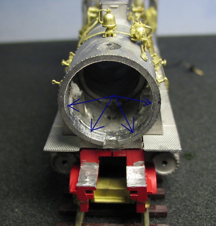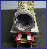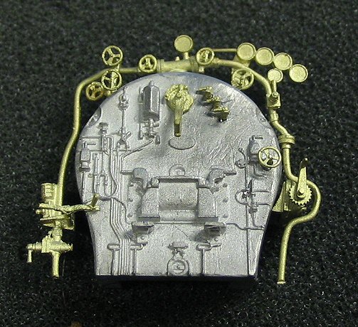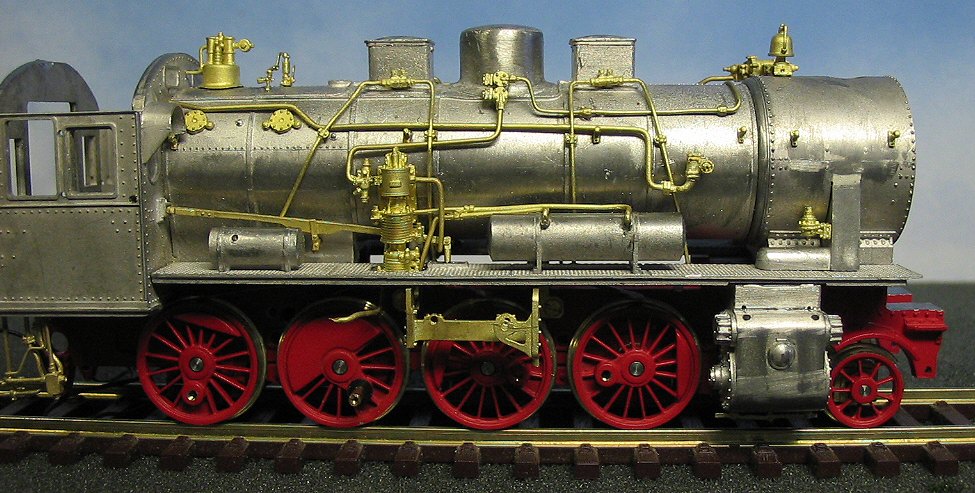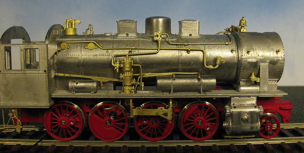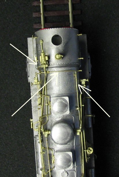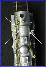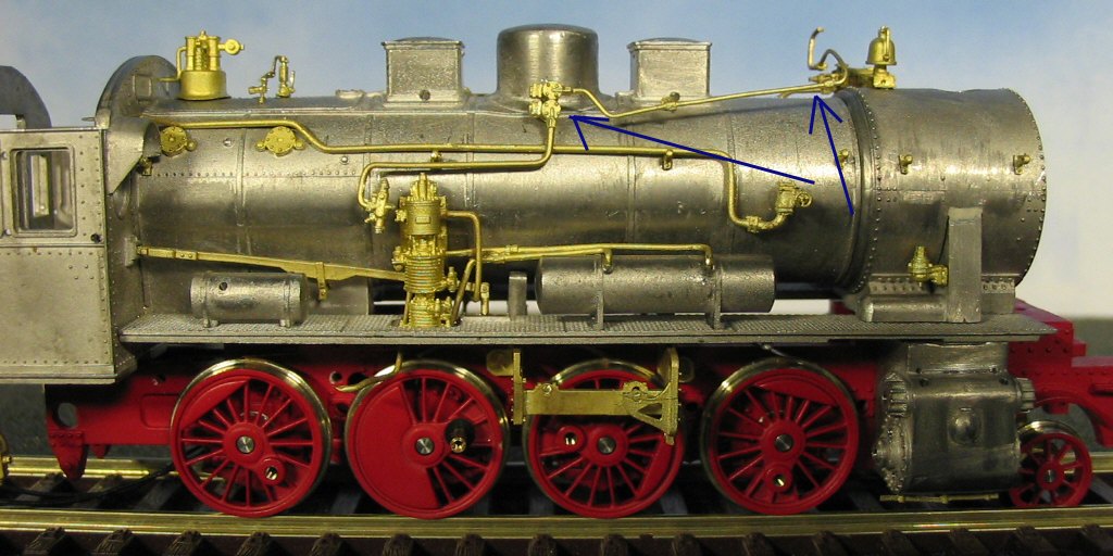 Nun kann die Lokführerseite zugerüstet werden. Zunächst muss die Leitung vom Führerhaus zum Kessel angeklebt werden. Die Leitung, die vom Dampfdom zur Glocke führt, habe ich zunächst am Dampfdom angeklebt. Nachdem der Leim fest war, habe ich die Leitung mit der Glocke verbunden. Das andere Ende der Leitung habe ich dann mit der Pumpe verbunden.