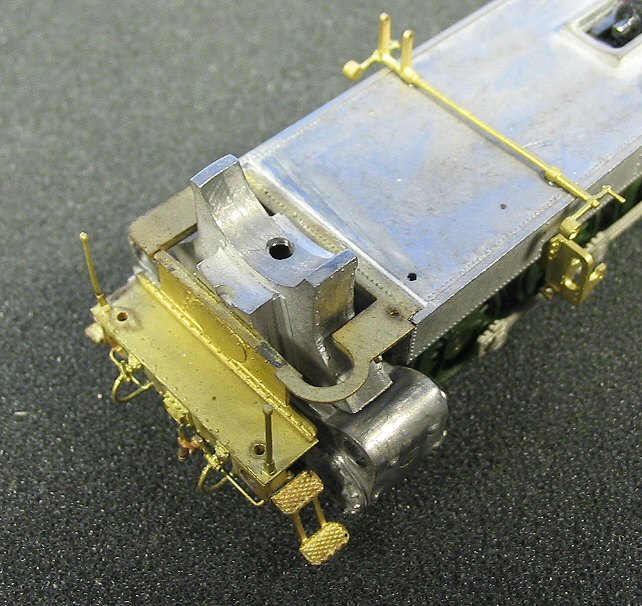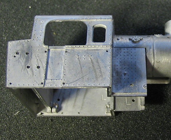 Vor der weiteren Ausrüstung des Gehäuses, habe ich die Löcher für die Griffstangenhalter nachgebohrt. Die Löcher sind war bereits gebohrt, jedoch werden diese durch den Zusammenbau des Führerhaus durch die anderen Wandteile teilweise wieder zugesetzt. Beim Nachbohren ist darauf zu achten, dass der Bohrer nicht wegläuft und im schlimmsten Fall das Gehäuse beschädigt. Teilweise sind die Löcher - vorbildgerecht - sehr weit am Rand. Es könnte passieren, dass der Bohrer beim Bohren in der Seitenwand des Führerhauses - etwa an der Vorderwand des Führerhauses wieder austritt. Sollte es dennoch passieren, dann die Stelle verspachteln und verschleifen. Gehen dabei Nieten verloren, so kann bei Fohrmann Ersatz bestellt werden. Ein kleines Loch bohren und die Ersatzniete einkleben.
