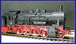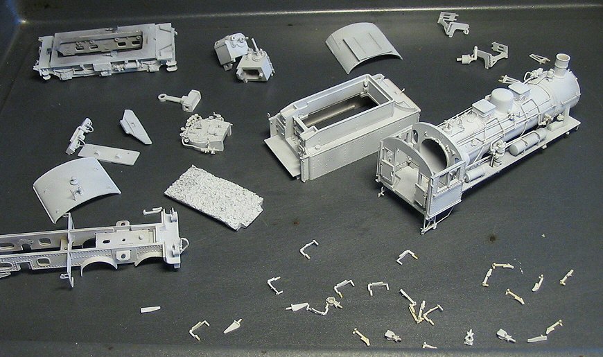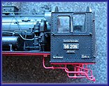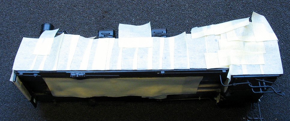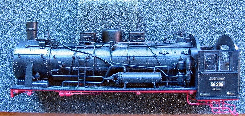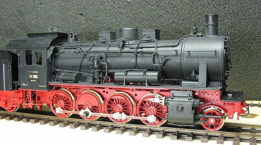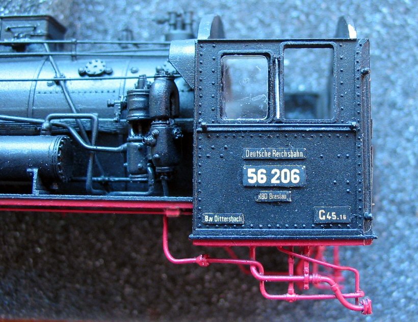 Bei der Lackierung der BR 56 ist mir ein schwerer Fehler unterlaufen. Die Folge war, das ich die Schilder wieder entfernen, das Modell mit Aceton abwaschen und neu lackieren musste. Was war passiert? Nun, ich hatte die Grundierung mit zu hohem Druck und viel zu trocken aufgetragen. Die Folge war, dass nach dem Grundieren eine raue Oberfläche entstand. Es fühlte sich an wie 1000er Schleifpapier. Das kam daher, dass durch den hohen Druck das Bindemittel in der Farbe bereits in der Luft fast vertrocknet ist und die Pigmente quasi aufrecht stehend auf das Modell geschossen wurden. Ich dachte dann, ich könnte alles retten, indem ich mit schwarz und sehr feucht lackiere. Es brachte aber nichts die Grundierung ließ sich durch das Schwarz nicht mehr lösen. Folge war, dass das gesamte Modell rau war und einen Grauschleier aufwies. Das nebenstehende Bild zeigt das gesamte Elend.