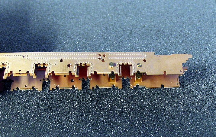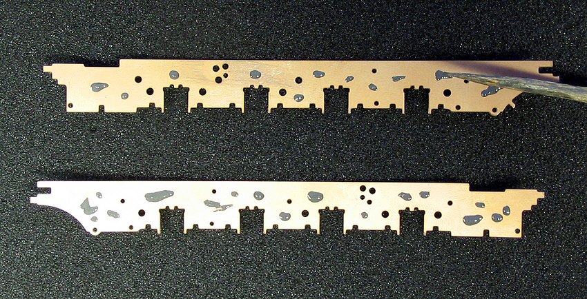 Auf den Detaillierungsblechen werden einige Tropfen des Lötmittels verteilt. Danach werden die Bleche auf dem Rahmen positioniert und mit den Distanzstücken verschraubt. Danach ist das gezündete Lötgerät mit der Flamme langsam über die Detailierungsbleche zu führen. Zusätzlich sind die Seiten der Detaillierungsbelche mit einem Schraubenzieher an den Rändern vorsichtig anzudrücken. Die Flamme nicht zu lange auf eine Stelle halten, da diese sehr heiß wird. Das Detailierungsblech könnte ausgeglüht werden und sich dadurch verziehen. Es wäre dann nicht mehr zu richten. Wenn zwischen den Blechen leichter Rauch aufsteigt, dann zeigt dies, dass das Flussmittel verdampft und das Lötzinn geschmolzen ist. Die Lötverbindung ist dann fest. Teilweise kann es passieren, dass das Flussmittel der Lötpaste verdampft ist, ohne das genug Lötzinn geschmolzen ist. In diesem Fall ist alles auseinander zu schrauben und noch einmal zu verlöten.