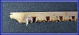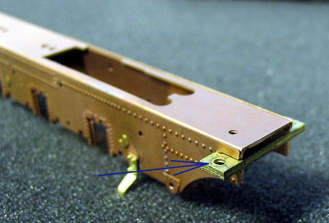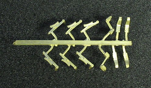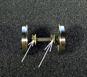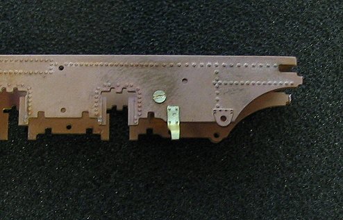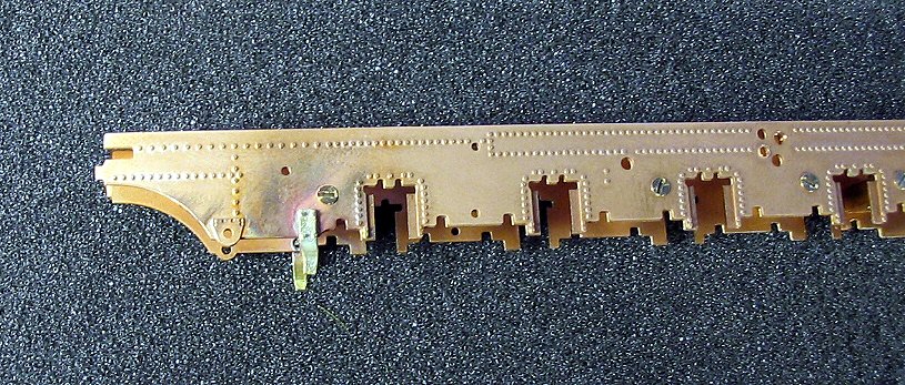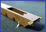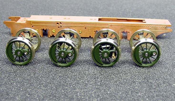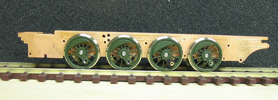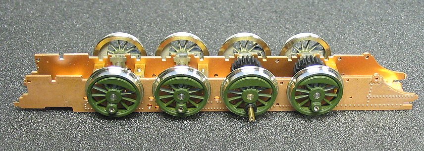 Zur Probe können nun die Radsätze eingesetzt werden, sie sind alle federn gelagert. Dazu liegen dem Bausatz kleine Federn bei, die in die Achsaufnahmen im Rahmen gesteckt werden müssen. Die Federn werden allerdings erst nach dem Lackieren eingesetzt. In diesem Bauabschnitt werden die Radsätze ohne die Federn eingesetzt. Teilweise sitzen die Radsätze recht stramm in den Führungen des Rahmens. Wegen der angestrebten Federwirkung darf dies aber nicht sein. Die Radsätze müssen sich in den Führungen leicht bewegen lassen. Dazu die ist in den Nuten der Radsätzen mittels einer Nadelfeile ein wenig Material abzutragen. Alternativ können auch die Aufnahmen im Rahmen leicht befeilt werden. Dabei ist immer wieder zu prüfen, ob inzwischen so viel Material abgetragen ist, dass sich der Radsätze in den Führungen leicht bewegen lässt. Wenn dies der Fall ist, dann die befeilten Stellen noch ein wenig mit 1oooer Schleifpapier verputzen. Danach ist der Rahmen mit den Radsätzen auf das Gleis zu setzen. Die Radsätze müssen in der obersten Stellung zu liegen kommen. Nun kann geprüft werden, ob der Rahmen gerade ist. Sollte dies einmal nicht der Fall sein, dann muss der Rahmen entsprechend nachgebogen werden. Dazu den Rahmen - ohne Radsätze - in beide Hände nehmen und in die Richtung verdrehen, in die gebogen werden muss. Dabei nicht zu zimperlich vorgehen - es darf schon ein kräftiger “Ruck” sein.