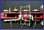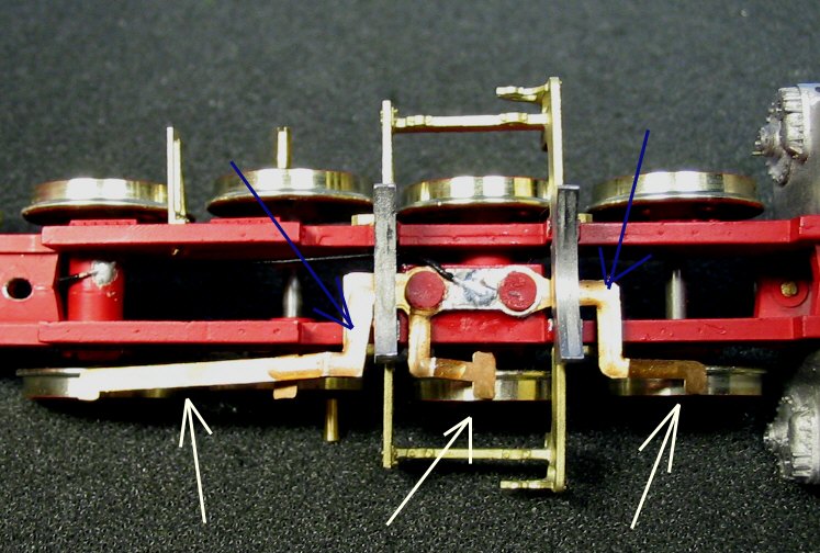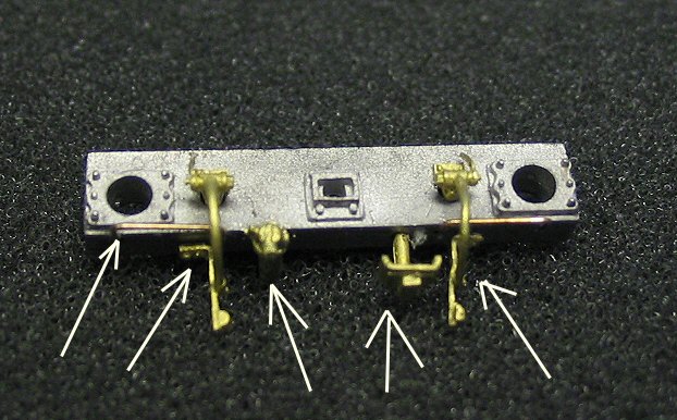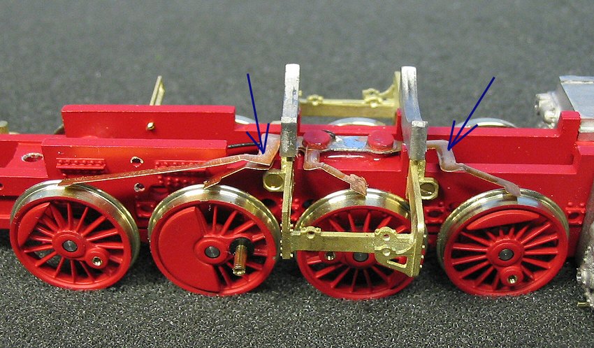 Hier sind einige Nebenarbeiten zusammengefasst. Zum einen die Installation der Stromaufnahmen an der Lok, zum anderen die Zurüstung der Pufferbohle sowie die Zurüstung der Zylinderblöcke. Zunächst müssen die Plastikstreifen aufgeklebt werden. Diese Isolieren die Stromabnahmefedern gegen das Gehäuse. Die Blattfedern zur Stromaufnahme werden zunächst entsprechend der Bedienungsanleitung aufgeklebt. Die Stromabnahmefedern stoßen bei aufgesetztem Gehäuse gegen die Umläufe. Das würde, trotz Lackierung und gerade im Digitalbetrieb, ein Kurzschluss zur Folge haben. Daher habe ich die Stromabnahmefedern an der Oberseite mit Kleber bestrichen. So erreicht man eine optimale Isolierung.