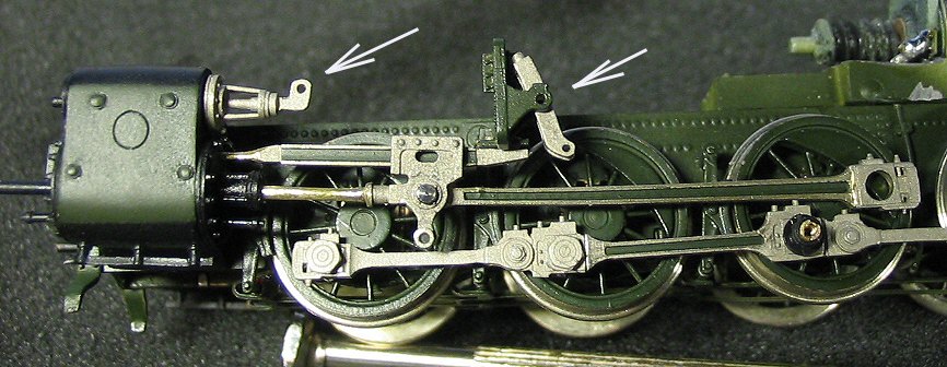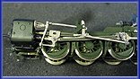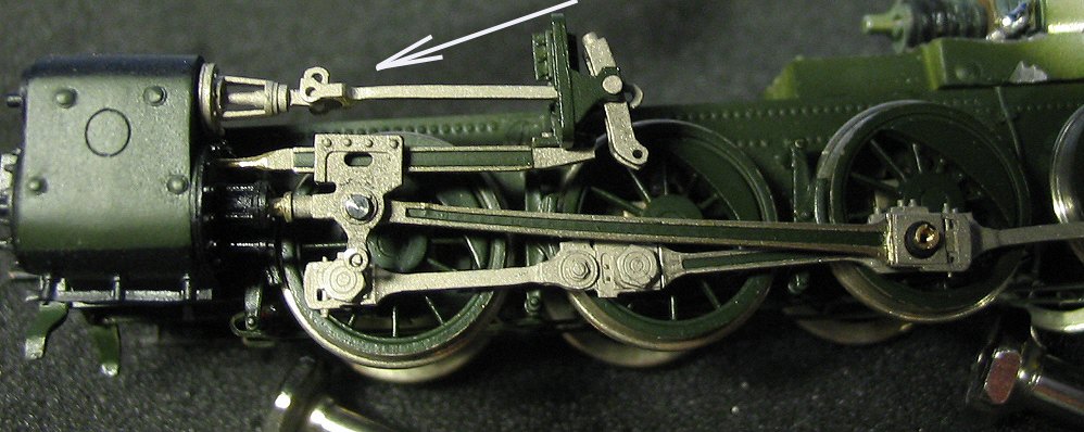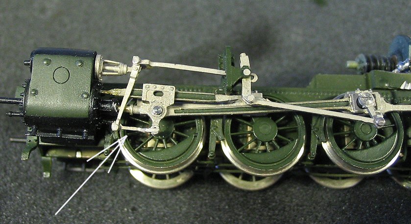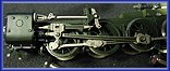 Jetzt die bereits vorbereite Gegenkurbel auf den Treibradsatz aufschrauben. Die Kurbel hat eine Führungsnut. Sie muss so aufgeschraubt werden, dass sie ins Zentrum des Radsatzes zeigt. Jetzt mit der Schwinge verbinden. Die Steuerstange mit dem Zylinder und der nach unten zeigenden Stange verbinden. Das ist ein bisschen fummelig, da diese Stange oben zusammengedrückt werden muss. Vorher ist diese Stange mit der kleinen unteren Stange zu vernieten. Niemals an der Lok selbst Nieten! Dann noch die kleine Stange mit dem Kreuzkopf verbinden. Jetzt das Fahrwerk auf das Gleis setzen und prüfen. Es kann sein, dass die senkrecht herabhängende Stange an das kleine aus dem Zylinder ragende Teil stößt. Das Teil am Zylinder etwas nach innen biegen. Zudem muss an der isolierten Seite die Treibstange ein wenig nach außen gebogen werden und zwar so, dass sie nicht mit den Schrauben der Kuppelstange in Berührung kommen kann. Passiert das, gibt es einen Kurzen und die Lok bleibt - gerade im Digitalbetrieb - stehen. Ebenso stößt die Schraube des ersten Kuppelradsatzes mit der Steuerung vom Kreuzkopf zusammen, was bei mir immer einen Kurzschluss verursachte. Ich habe dann die Schraube mit Sekundenkleber behandelt. Das ist aber nicht der Weisheit letzter Schluss. Vielleicht weiß jemand eine bessere Lösung.