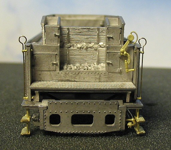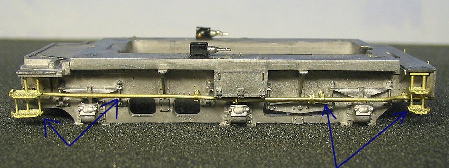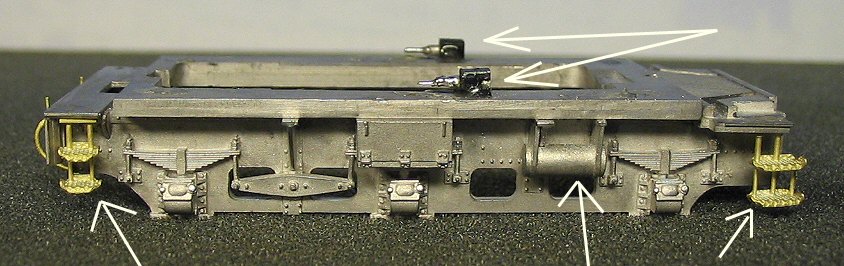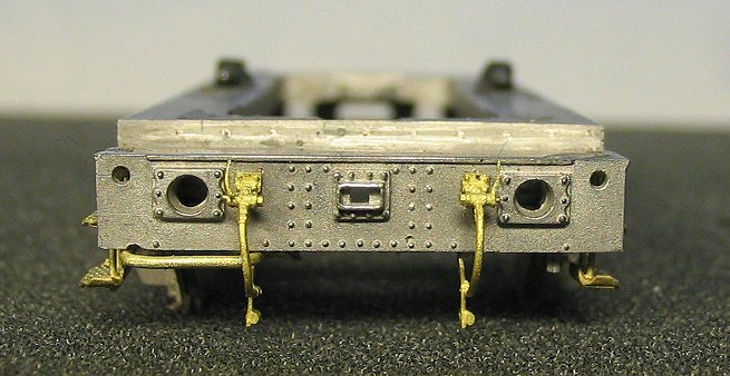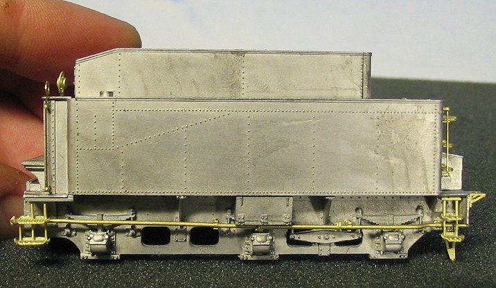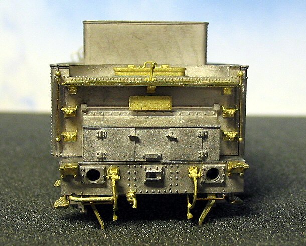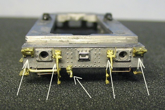 Der Rahmen kann nun mit den Zurüstteilen ausgestattet werden. Diese werden angepasst und geklebt. Die seitliche Leitung besteht aus zwei Teilen. Die Teilung befindet sich unter dem Kasten und ist somit nicht sichtbar. Zudem können die seitlichen Trittstufen angebracht werden. Zusätzlich können auf der Deckplatte die Buchsen für die Stecker der Stromaufnahme angeklebt werden. Die Stromabnahme der Lok wird per Kabel in den Tender geleitet. An das Ende der Kabel wird jeweils ein Stecker angelötet und dieser in die Buchsen gesteckt.