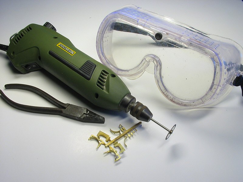 - Skalpell - Kleinbohrmaschine - HSS Spiralbohrer mit den Größen von 0,3 mm bis 1,5 mm - kleiner Schraubstock - große Unterlage aus Schaumstoff - absolut plane Glas-, Stahl-, Stein- oder Marmorplatte - Set Schraubendreher für Feinmechaniker - verschiedene Flachzange (Feinmechaniker) - Satz Nadelfeilen - 0,2 mm Drahtlitze (gibt es bei Weinert) - Schutzbrille