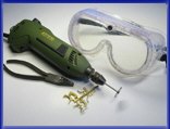 - Skalpell - Kleinbohrmaschine - HSS Spiralbohrer mit den Größen von 0,3 mm bis 1,5 mm - kleiner Schraubstock - große Unterlage aus Schaumstoff - absolut plane Glas-, Stahl-, Stein- oder Marmorplatte - Set Schraubendreher für Feinmechaniker - verschiedene Flachzange (Feinmechaniker) - Satz Nadelfeilen - 0,2 mm Drahtlitze (gibt es bei Weinert) - Schutzbrille